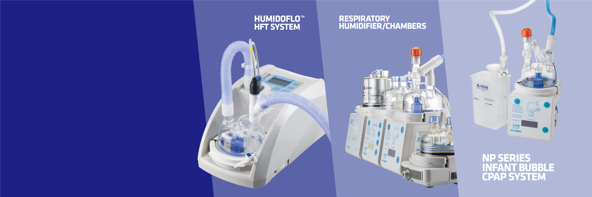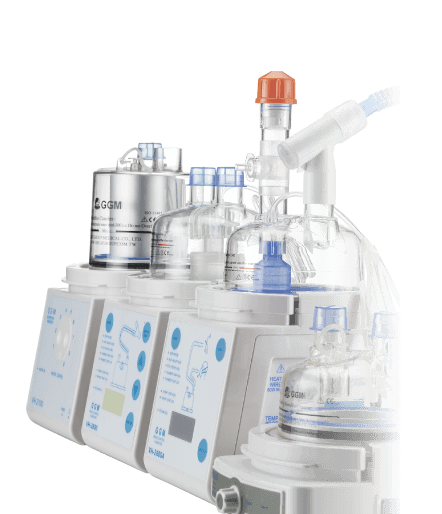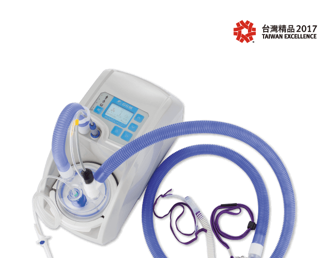統呼吸器使用插管、面罩等侵入式治療造成病患的不適,生活品質低劣。GGM研發Humidoflo®經鼻高流量氧氣治療系統,使用大孔徑鼻管通氣,可減少對面罩通氣(45%)及插管通氣(9%)的使用。 Humidoflo®經鼻高流量氧氣治療系統經由GGM專利設計的大孔徑鼻導管,提供每分鐘最高50公升、37℃及相對溼度100%的氣體通氣,舒適、美觀且方便配戴。
